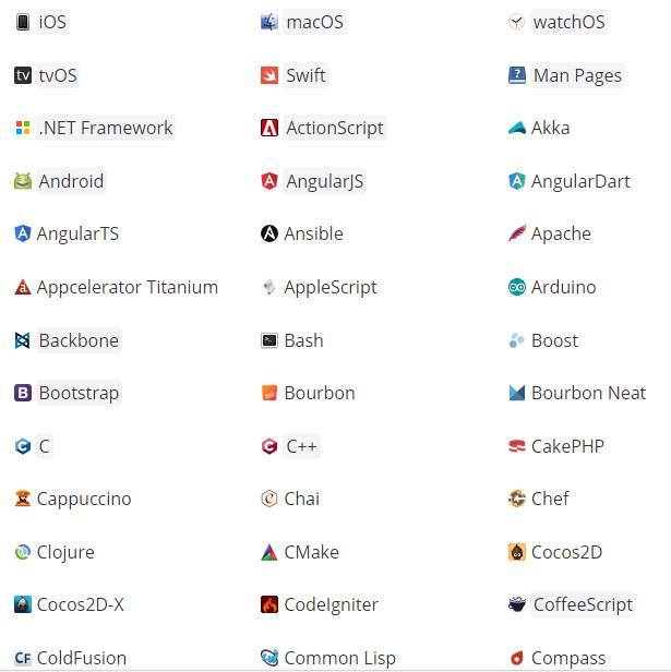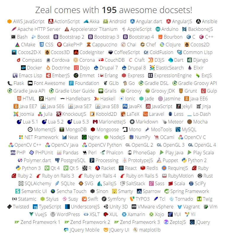 Listed below are all the various documentation sets Dash comes with. The most popular ones are highlighted. All documentation sets have been generated and are maintained with the utmost care.