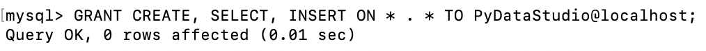 GRANT CREATE, SELECT, INSERT ON * . * TO PyDataStudio@localhost;
