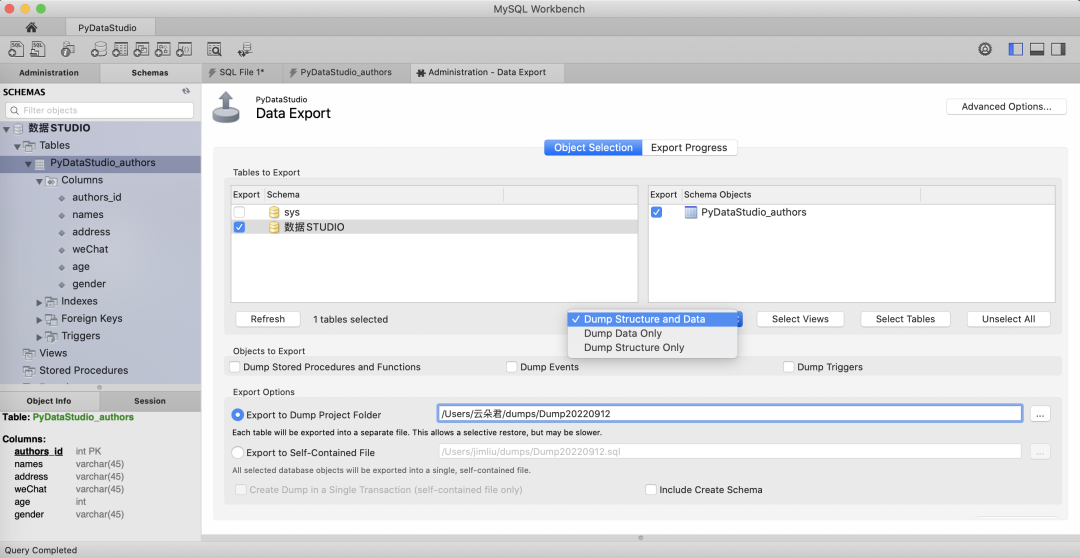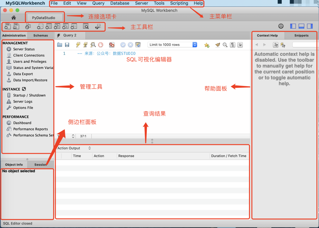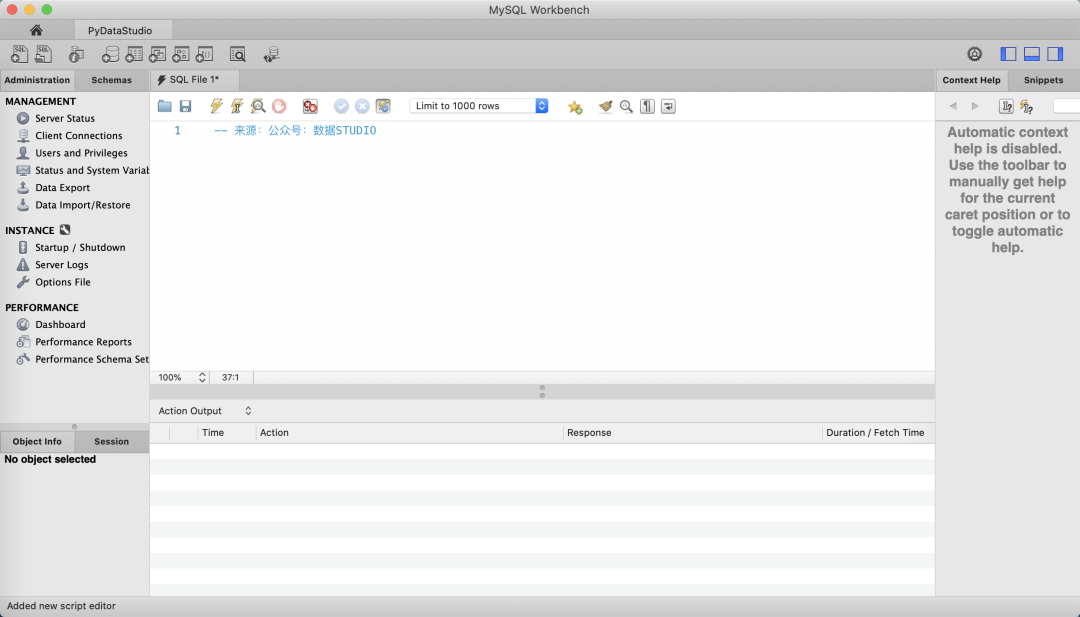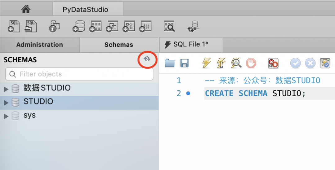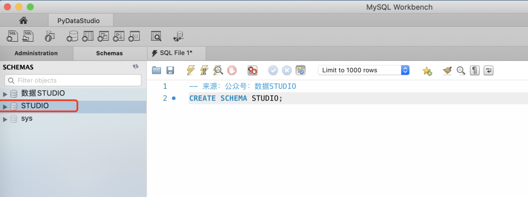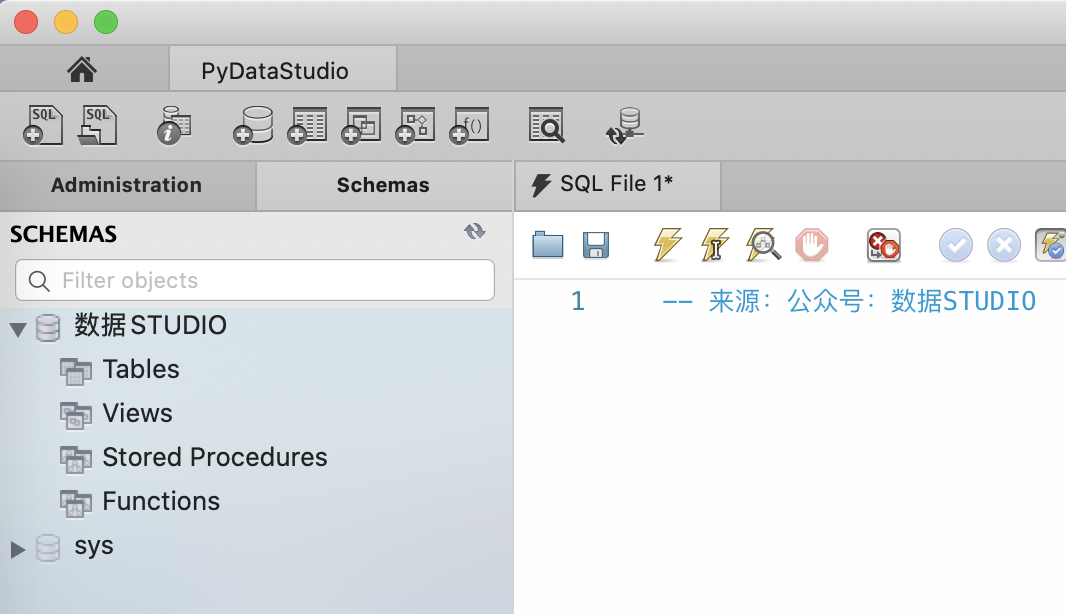 上一步完成后,双击连接名称“PyDataStudio”连接MySQL服务器,如下图示例所示。