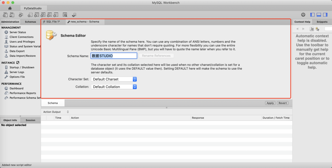 继续并单击工具栏中的 “create a new schema in the connected server” 按钮。你应该会看到类似于下面的屏幕截图的内容。