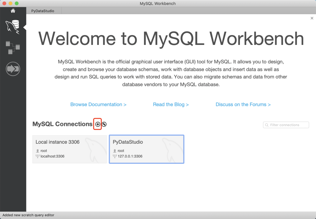 打开工作台应用程序后,点击如下图写有 “+” 的按钮,建立新的连接。