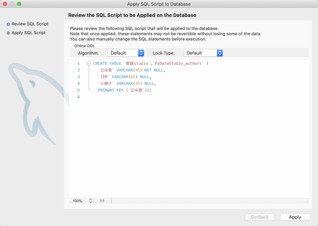 完成上一步(输入schema名称)后,单击窗口底部的 “Apply” 按钮。