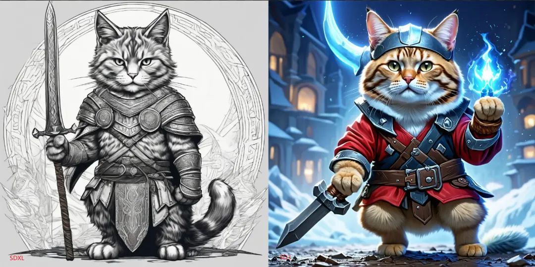 提示词:full body,cat dressed as a Viking,with weapon in his paws,battle coloring,glow hyper-detail,hyper-realism,cinematic