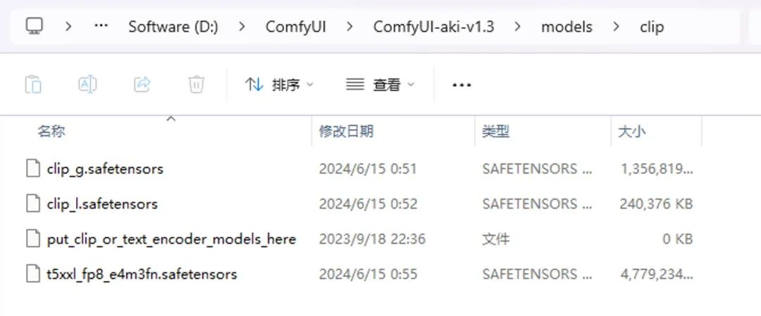 这里面是三种不同的文本编码器,即两个CLIP模型和T5模型,其中T5模型还提供了两个量化版本,一个16位量化(fp16),一个是8位量化(fp8)。