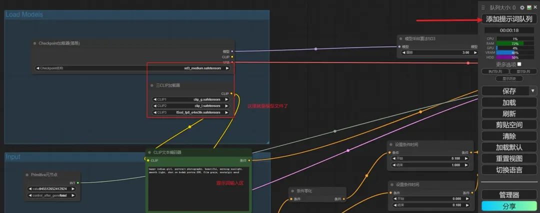 sd3_medium_incl_clips.safetensors 则是 sd3_medium + clip_g + clip_l 的结合体,这个模型体积会小点,但是没有T5XXL编码器的模型性能会有所不同。