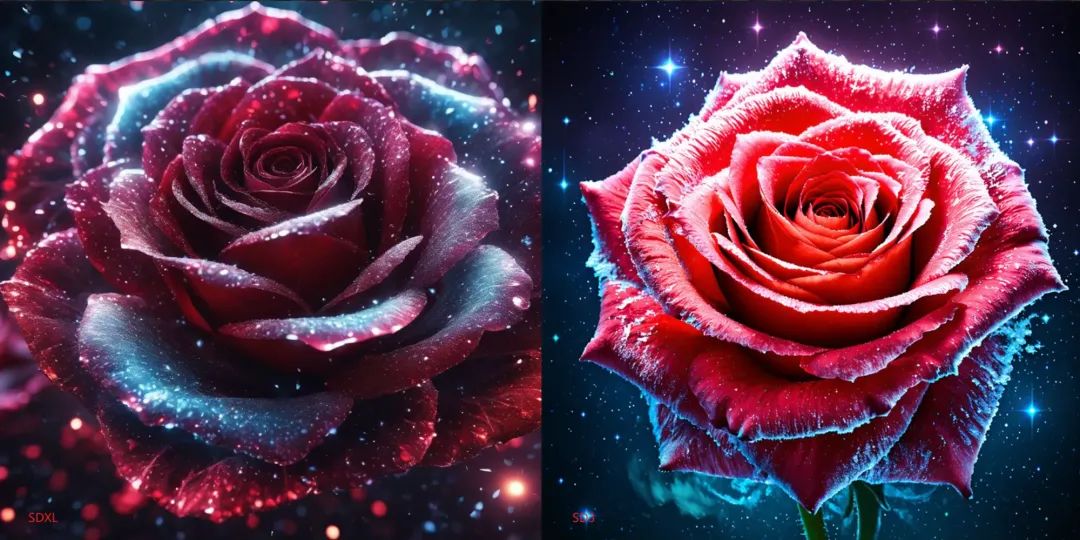 提示词:a frozen cosmic rose, the petals glitter with a crystalline shimmer, swirling nebulas, 8k unreal engine photorealism, ethereal lighting, red, nighttime, darkness, surreal art