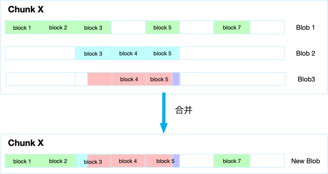 文件在读的场景时,读取到某个 Chunk 时,会将所有的 Blob 进行合并,获取到一个新的 Blob,再将新的 Blob 对应的数据块 Block 返回给上层调用服务。具体如下图所示: