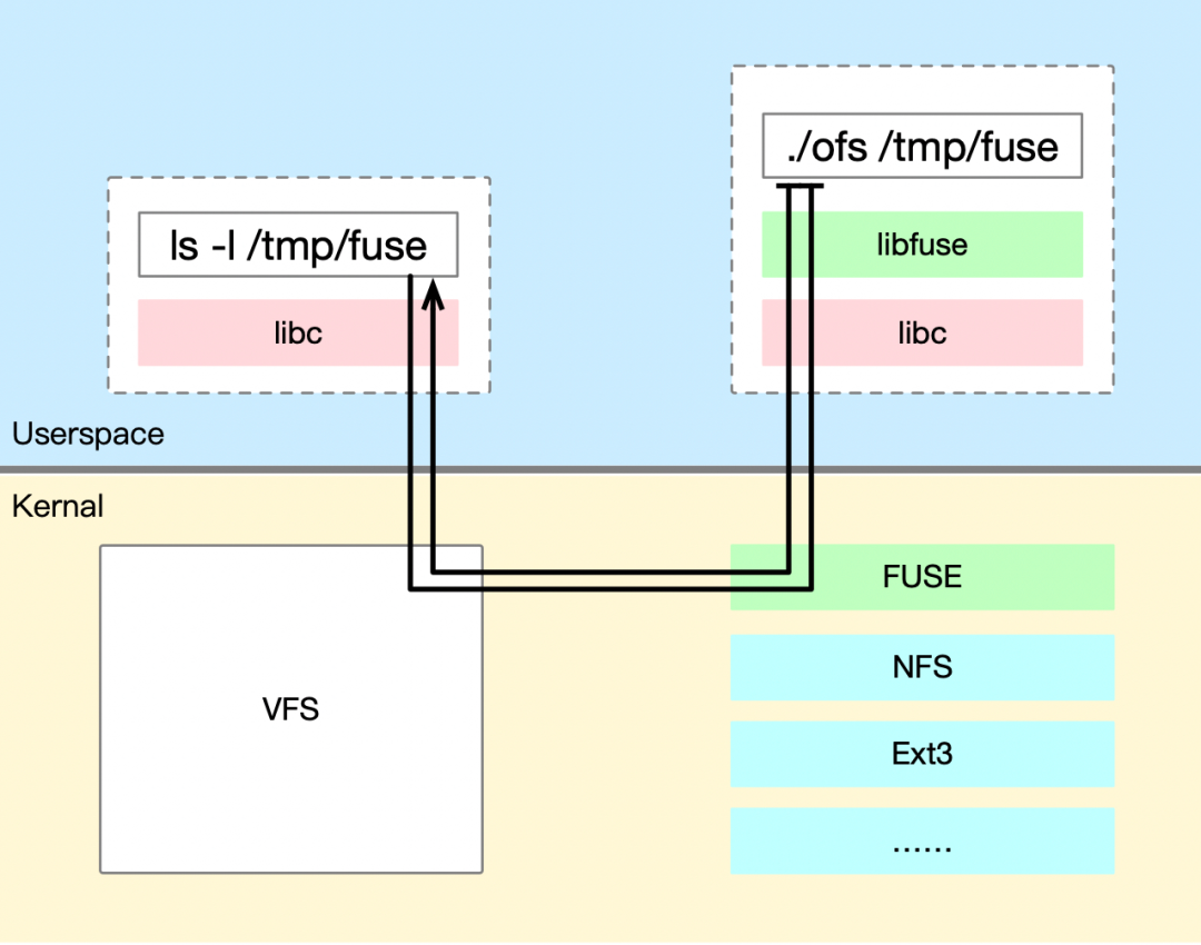 FUSE 的主要工作原理是通过内核模块(kernel module)和用户态库(userspace library)之间的通信,将文件系统的请求从内核传递到用户态进程,然后在用户态进程中处理这些请求,并将结果返回给内核。这种设计允许用户态进程处理文件系统操作,而无需直接访问内核数据结构或硬件设备。具体如下图所示: