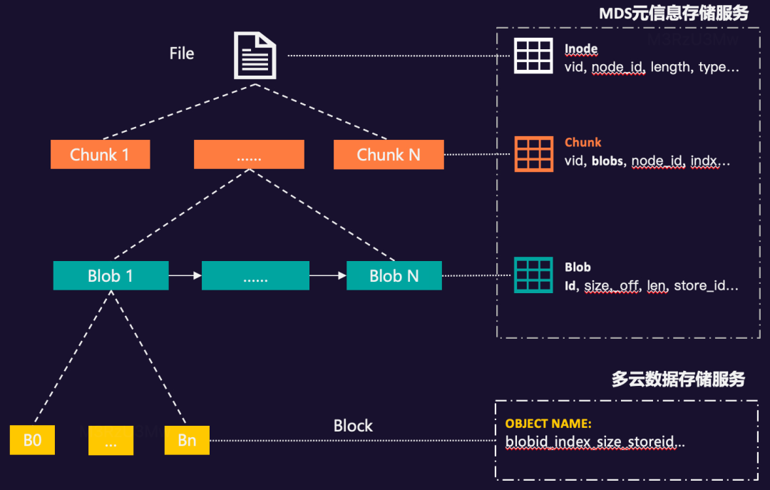 Chunk 和 Blob 数据信息我们存储到自研的 MDS 元信息存储服务中,而 Block 分块,我们存储在自研的 DFS 数据存储服务或公有云的S3、cos、oss等产品中。