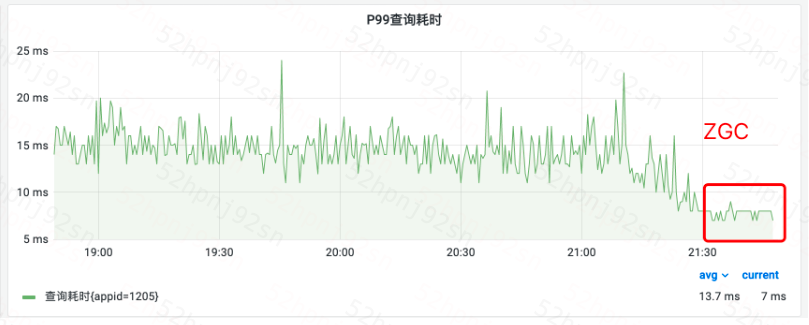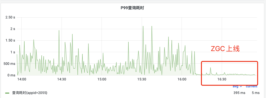 之前,有集群经常发生内存不回收问题。如下图,上线ZGC后,P99从800ms降低到30ms,下降96%;平均查询耗时从25ms降低到6ms,下降75%。