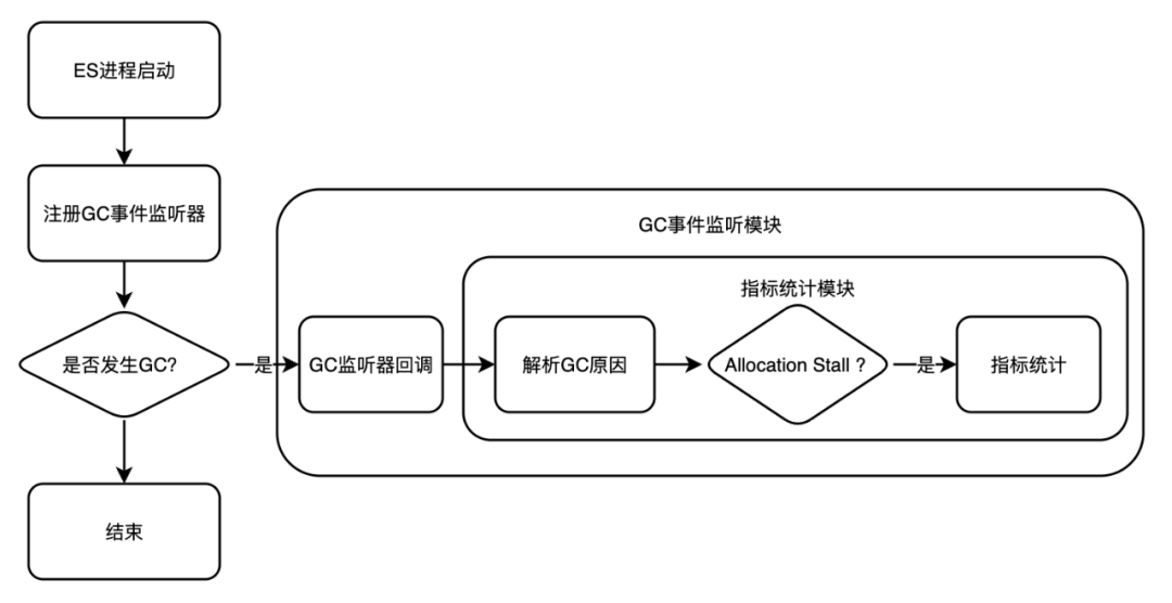 针对这些问题,我们设计了一套ZGC指标统计体系。首先重构ES指标统计模块,使其能够统计ZGC Cycles和ZGC Pauses指标。其次,针对Allocation Stall没法统计问题,通过注册GC事件监听器,配合事件回调机制,解析GC Caues从而实现对Allocation Stall的统计。与此同时搭建ZGC Allocation Stall的监控报警体系。指标统计流程如下图所示,ZGC部分指标展示如下: