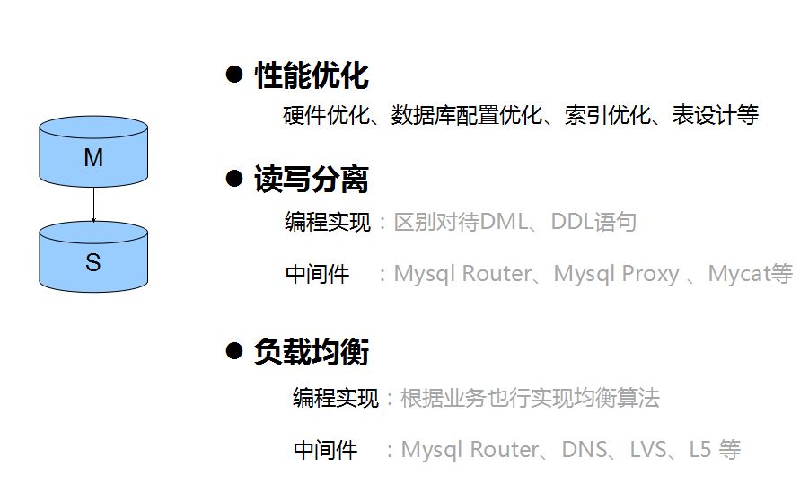 考虑一主一从的多数初衷是系统性能和系统高可用性问题,除了单Master场景中的备份工作需要做好以外,还有性能优化、读写分离、负载均衡三项重点工作需要考虑。其中性能优化的内容比较多,也是一块大主题,要从系统的服务指标作为依据采取相应的动作,多数系统要求的是3秒内完成请求,总体换算下来,数据库大概可以有1.5秒的总执行时间,能满足这个性能要求就是合理的优化方案。下学期以这样的优先级来分别整理内容:索引优化 -》 表设计优化 -》数据库配置优化 -》硬件优化。