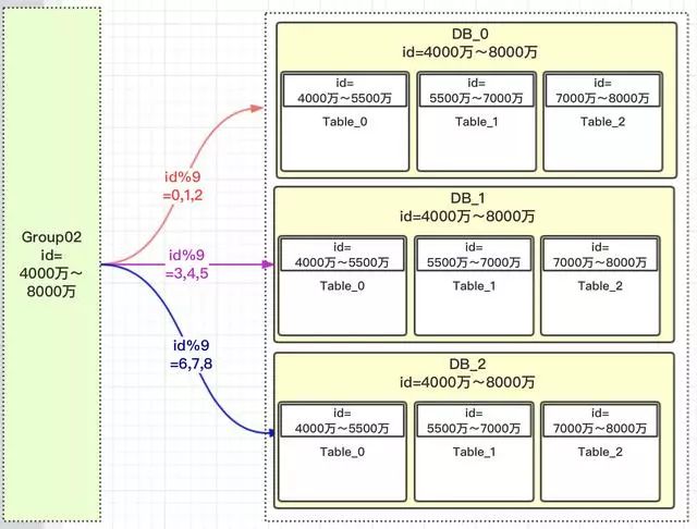 上图中我们对10进行取模,如果值为【0,1,2,3】就路由到DB_0,【4,5,6】路由到DB_1,【7,8,9】路由到DB_2。现在小伙伴们有没有理解,这样的设计就可以把多一点的数据放到DB_0中,其他2个DB数据量就可以少一点。DB_0承担了4/10的数据量,DB_1承担了3/10的数据量,DB_2也承担了3/10的数据量。整个Group01承担了【0,4000万】的数据量。