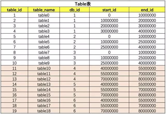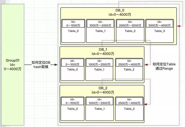 注意:小伙伴千万不要被DB_1或DB_2中table的范围也是0~4000万疑惑了,这个是范围区间,也就是id在哪些范围内,落地到哪个表而已。