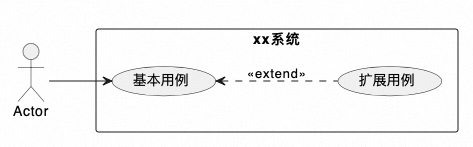扩展是用例之间的一种关系,其中一个用例(称为扩展用例)的行为增强了另一个用例(称为基本用例)的行为,用虚线箭头 + <<extend>>表示,箭头指向基本用例。