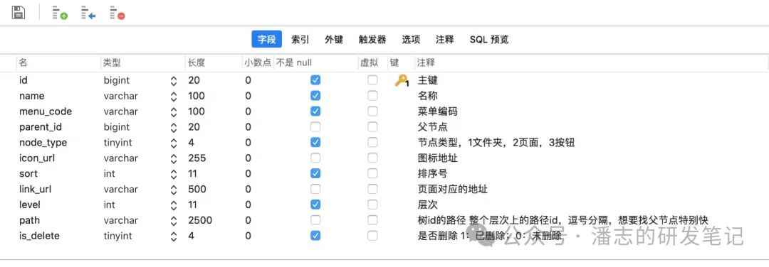 用户、角色表的结构设计,比较简单。下面,我们重点来解读一下菜单表的设计,如下: