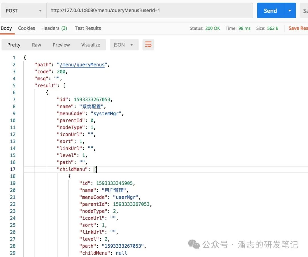 然后,编写一个通过用户ID查询菜单的接口,将数据结果返回给用户,代码示例如下!