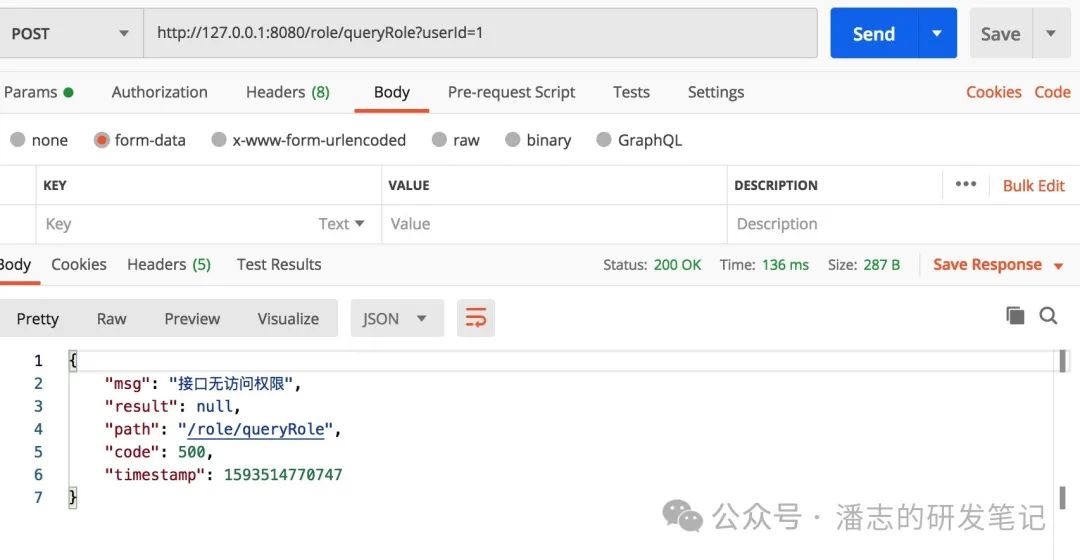 与预期结果一致!因为没有配置角色查询接口,所以无权访问!