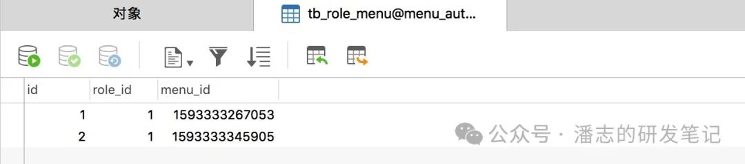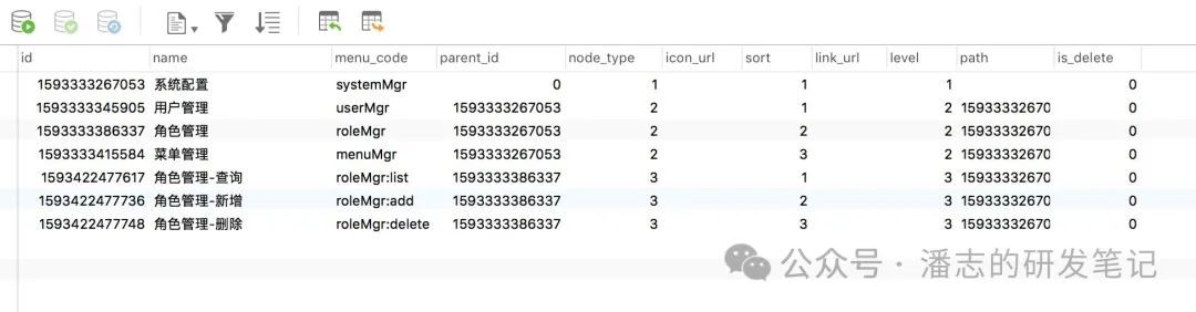 可以看到,整个菜单表就是一个父子表结构,关键字段如下: