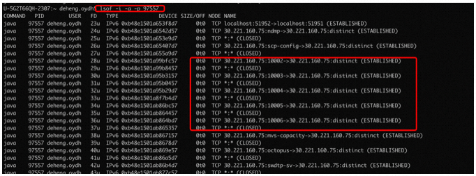 too many open files,这里说明打开的文件描述符过多,什么是文件描述符?文件描述符( file descriptor简称fd,请记住这个概念,后续会多次出现)在linux中,一切皆文件。实际上,它是一个索引值,指向一个文件记录表,该表记录内核为每一个进程维护的文件记录信息。由于本例中创建了三万个socket,而一个socket(即一个tcp连接)就对应一个文件描述符(fd),30000已经超过了系统默认的文件描述符限制。那怎么去查看fd信息呢?可通过lsof -i -a -p [pid]查看当前进程打开的tcp相关的文件描述符,如下图,红框标注的就是socket对应的fd: