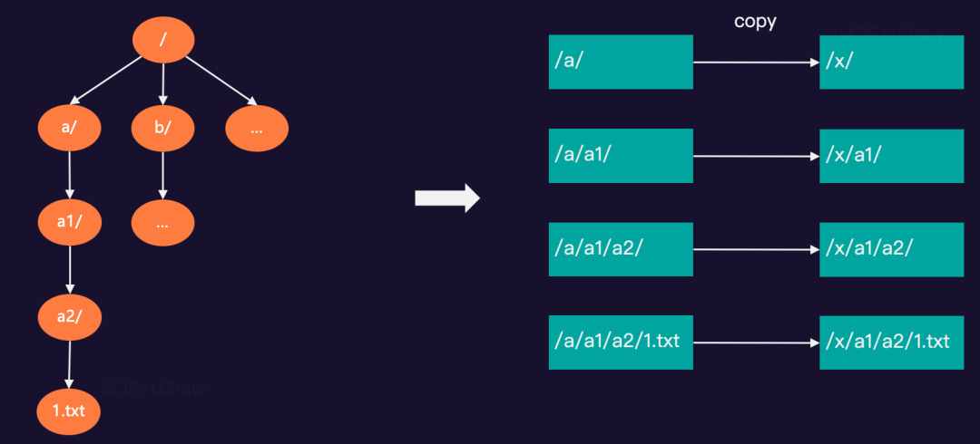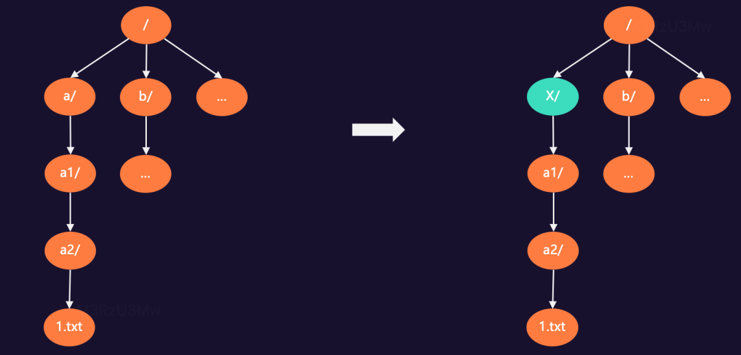 采用统一文件组织结构模型,在这种结构基础上实现不同存储协议,可实现真正的文件系统和对象存储系统。例如:通过ofs-test 桶中有“/a/a1/a2/1.txt…”等文件,通过文件系统 rename 根目录下的a/文件夹为x/,只需要修改目录树节点的名称,其他无需变更。