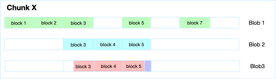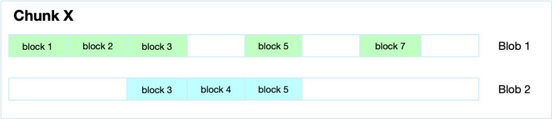 文件在写场景时,提高性能减少Blob数量,每个 Chunk 默认只生成一个 Blob,每次直接写入对应的数据块,我们称之为 block。具体如下图所示: