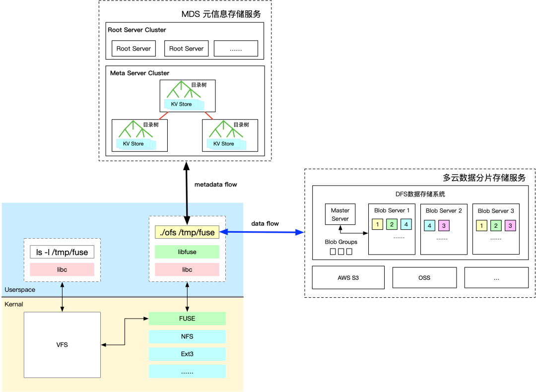 • 接收与处理 FUSE 的操作请求,与 MDS Cluster 交互实现文件元信息的增删改查及管控操作, 与自建 IDC 的 DFS 数据存储系统或公有云 OSS/S3/COS 等系统交互实现文件分片数据的增删改查。