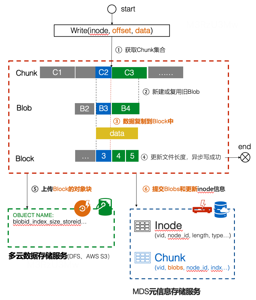 Chunk 和 Blob 数据信息我们存储到自研的 MDS 元信息存储服务中,而 Block 分块,我们存储在自研的 DFS 数据存储服务或公有云的S3、cos、oss等产品中。