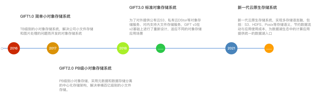2015年,滴滴为解决小文件和图片的存储,成立 GIFT 小对象存储项目。伴随着业务不断成长,我们面临的挑战也越来越多,经历多次非结构化存储架构演进,具体如下图所示: