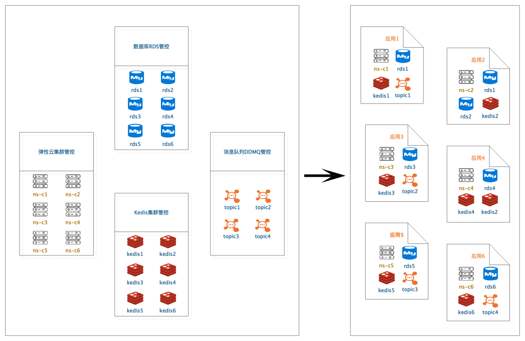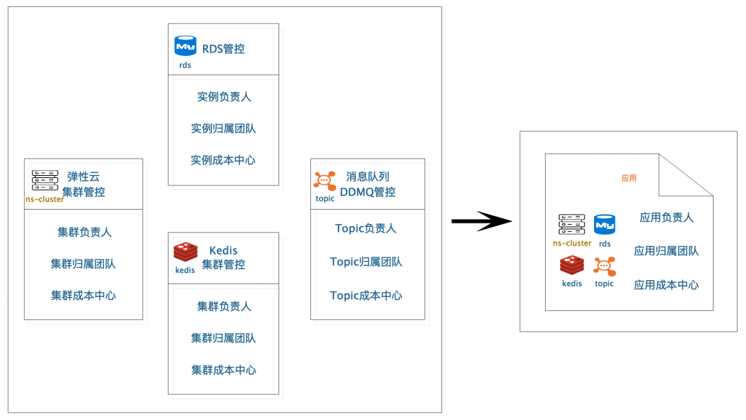 各个依赖资源(弹性云、RDS等)都有自己的一套管控及元信息,彼此割裂无同步,比如弹性云、RDS都有自己的负责人、成本归属团队。数据的大量冗余,导致数据更新困难:信息发生变更,需要同时更新所有资源平台的相关信息,且各个资源无关联关系(做到关联更新极其困难)。
