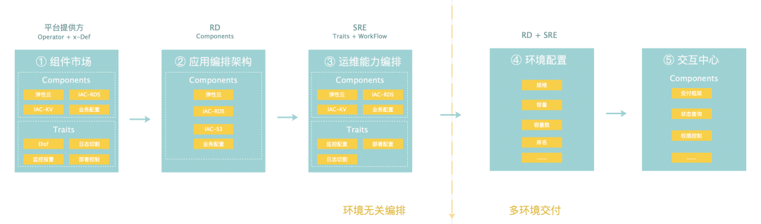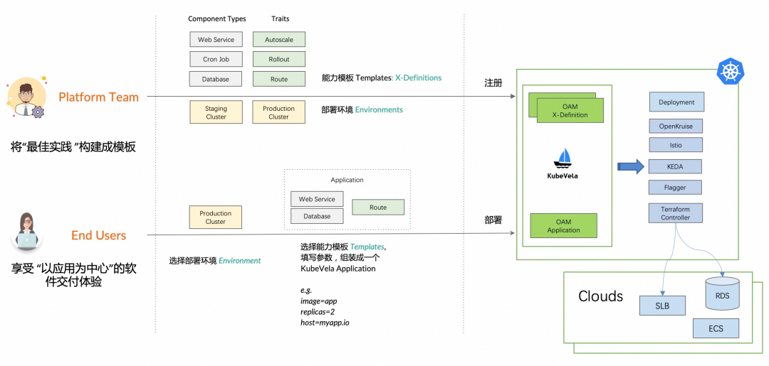 有了OAM模型的抽象能力,基础服务提供方(Platform Team)主要基于自建服务、上云服务、第三方云厂商服务封装提供给内部用户的基础服务:比如内部弹性云、RDS、Redis等等,屏蔽各个云厂商及不同平台的差异。而对于业务研发(End User)则专注业务逻辑设计,通过编排弹性云、RDS 等基础设施对外提供服务,从而降低平台相关性的学习成本。
