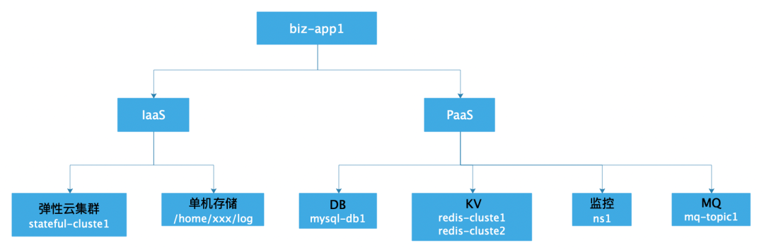 将计算资源、存储资源及一些偏运维配置按照服务维度做整体抽象及关联,这样使得服务有整体的视角,同时相对单个服务,整体才能更好的管理生命周期,避免出现孤儿资源,防止资源浪费。见图应用示例,可以看清一个应用所依赖的所有IaaS资源及PaaS资源。