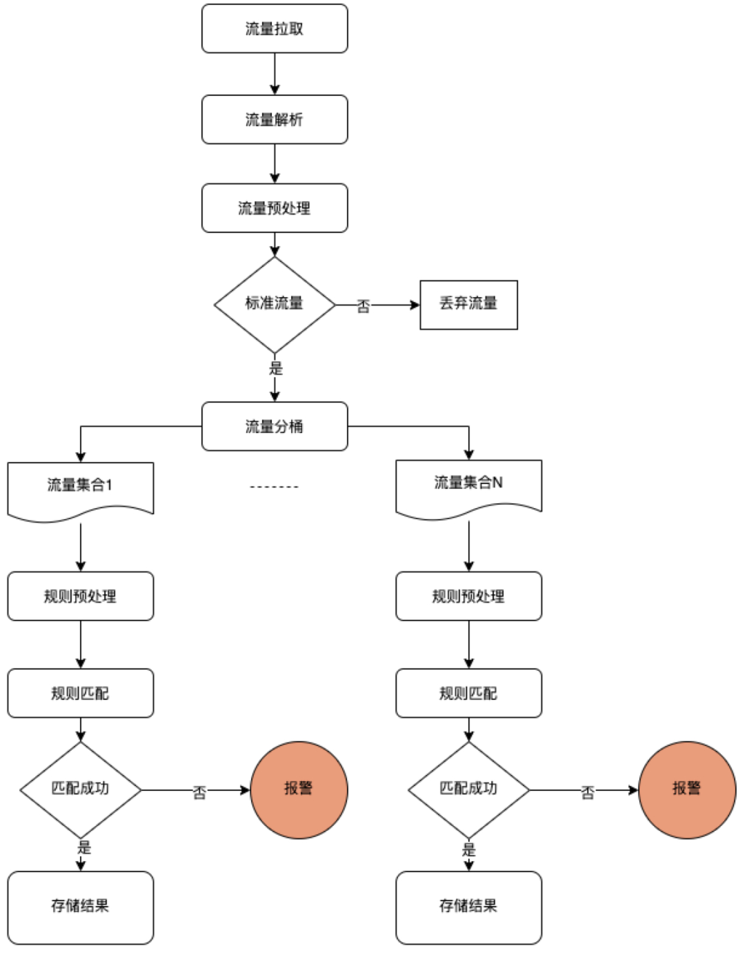 流量解析及处理:流量的预处理包含了字节流到完整应用层协议解析、异常数据过滤、流量关键元素的提取等步骤。目标是得到标准化的流量,可供后续规则引擎使用。