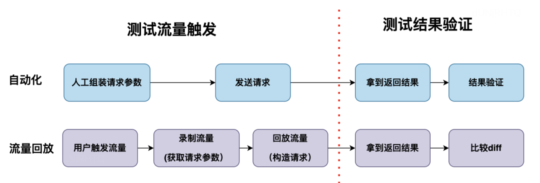 在构造请求方面,自动化是通过人工构造,而流量回放是通过录制线上用户触发的流量。在测试结果验证方面,自动化是通过编写assert校验来实现,而流量回放是通过diff来实现。