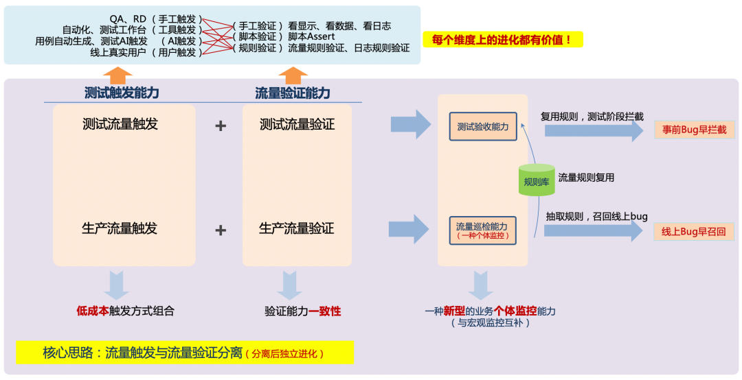 当我们将测试流量触发与测试结果验证分离后,我们可以集中火力,根据需要对两个维度单独发力。