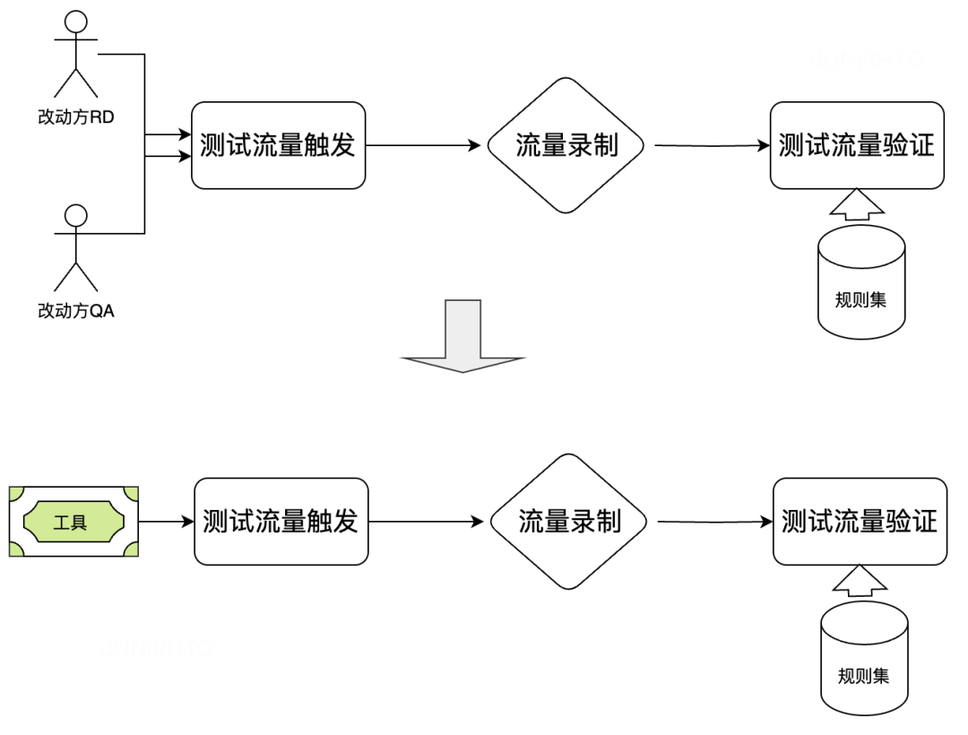 测试流量触发与测试结果验证并不是什么新技术,在我们传统的质量保障手段例如自动化和流量回放中,我们可以把它切分为测试流量触发与测试结果验证两个步骤。具体如下图所示: