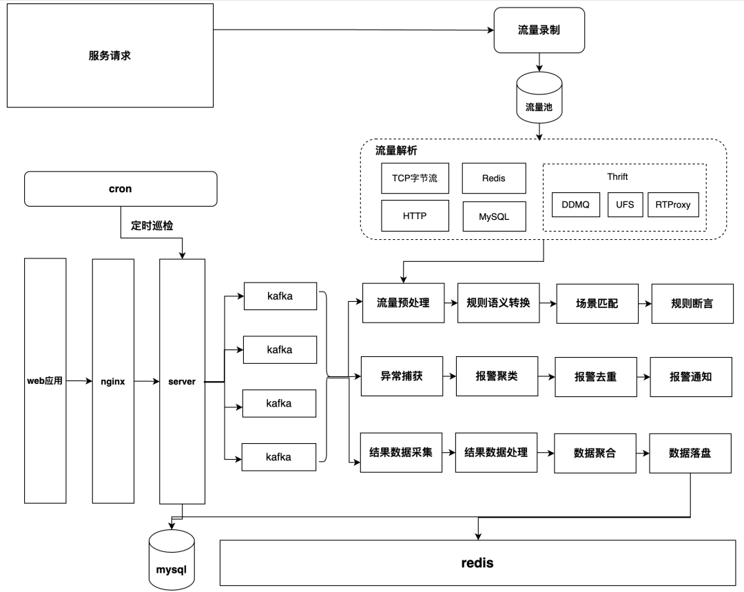 线上流量巡检的整体架构如下图所示,核心处理流程有:流量录制、流量解析及处理、流量分桶及校验、异常报警。