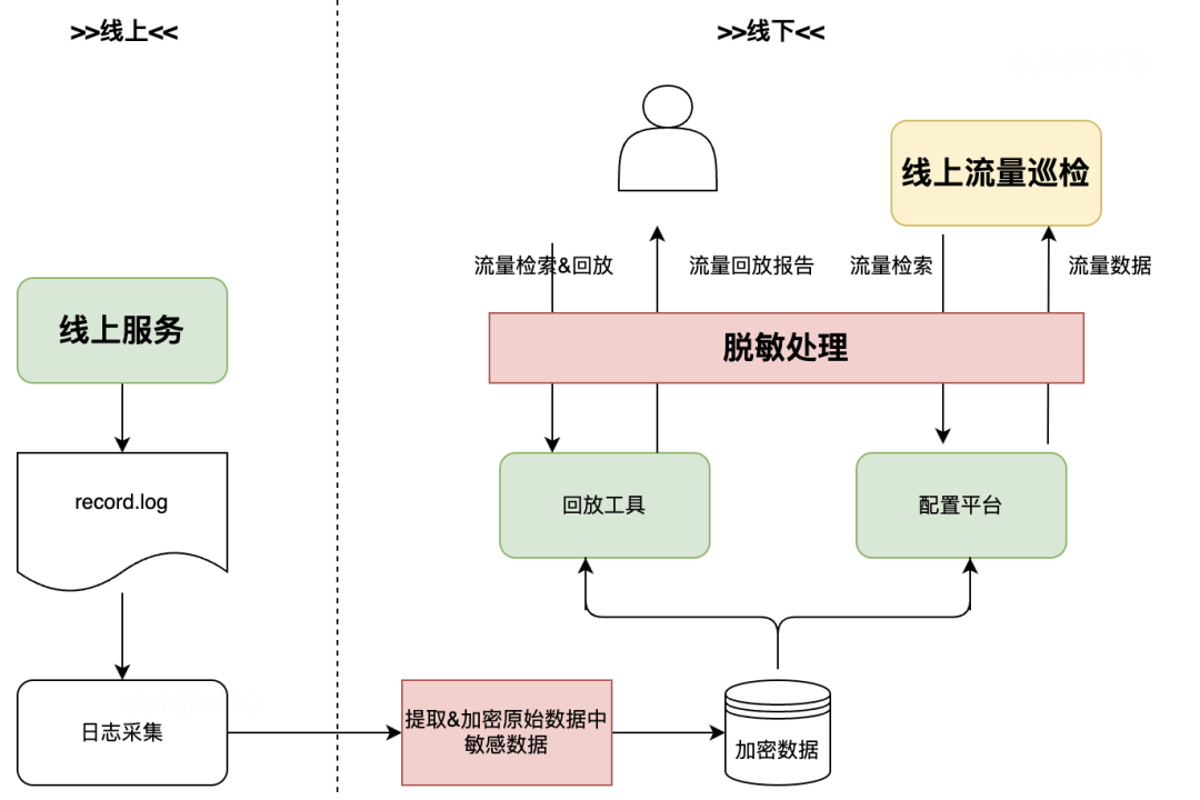 对线上用户单接口的流量元素录制后,将线上流量存储到ES前,从原始数据中提取出敏感信息,然后进行加密,使用加密后的数据对敏感信息进行局部替换,对原始数据中的敏感数据进行提取和加密,最终存储的是加密后的流量日志信息。