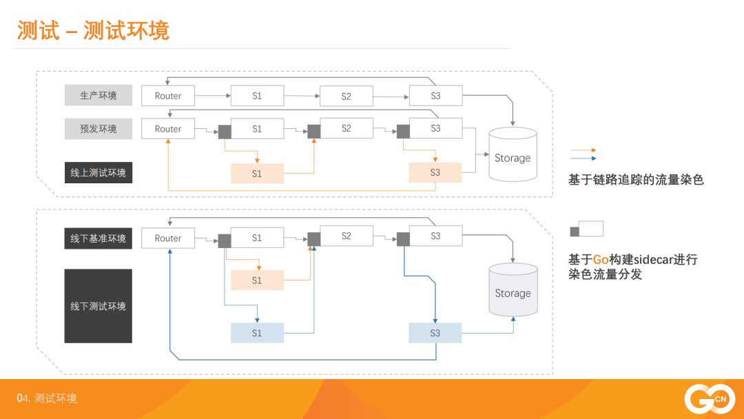 为了实现人手一套测试环境且互不影响,我们基于 Go 语言自研了一套 Sidecar,即在所有的基准环境前都部署一个 Sidecar,通过流量染色的方案按需构建测试环境,这是借鉴了 Service Mesh 和业界一些关于流量染色的思路。