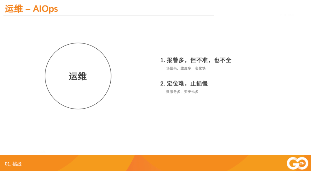 在运维方面,我们前面也提到过,主要问题有两个,一个是报警多、但不准、难维护,另一个是定位难、止损慢,而针对这两类问题,除了组织和机制的优化外,在技术层面,我认为最好的解法就是 AIOps。AIOps 的概念是由 Gartner 在 2016 年提出的,核心思想是通过机器学习来分析海量的运维数据,帮助运维提高运营能力。