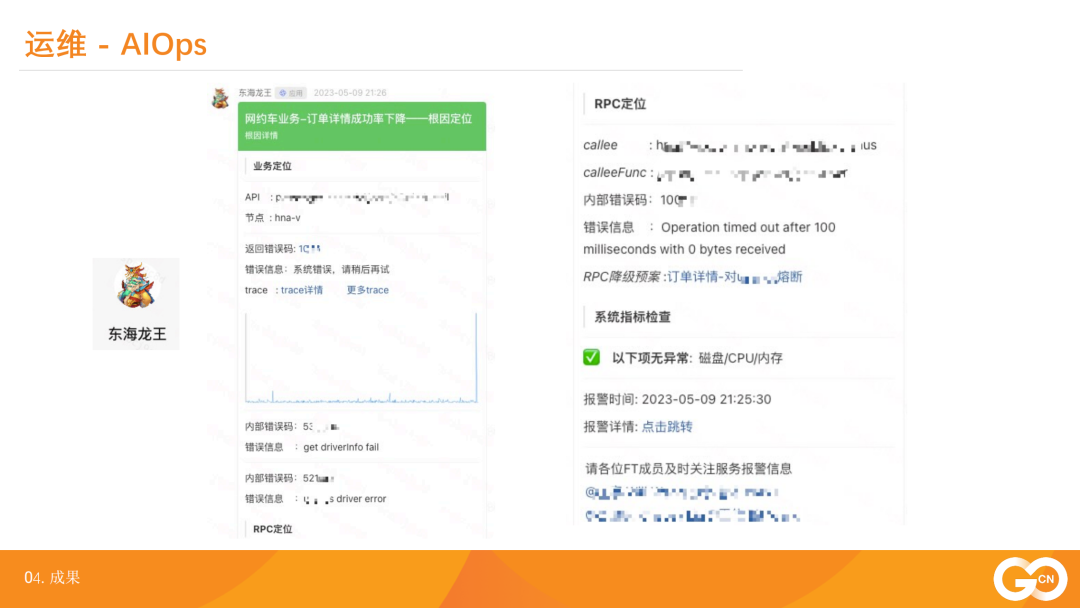 大家可以看下面这幅图,这是滴滴网约车现在正在使用的定位机器人,我们内部管叫它东海龙王。它基本上已经替代了我们大部分的定位工作,通过东海龙王我们可以几秒内把所有相关信息检索出来,比如根据接口成功率定位到是哪个机房出问题了 ,如果能够定位到某一个具体的机房,那我们就不需要再进行根因定位,可以直接操作切流止损了,等恢复后再来排查根因。