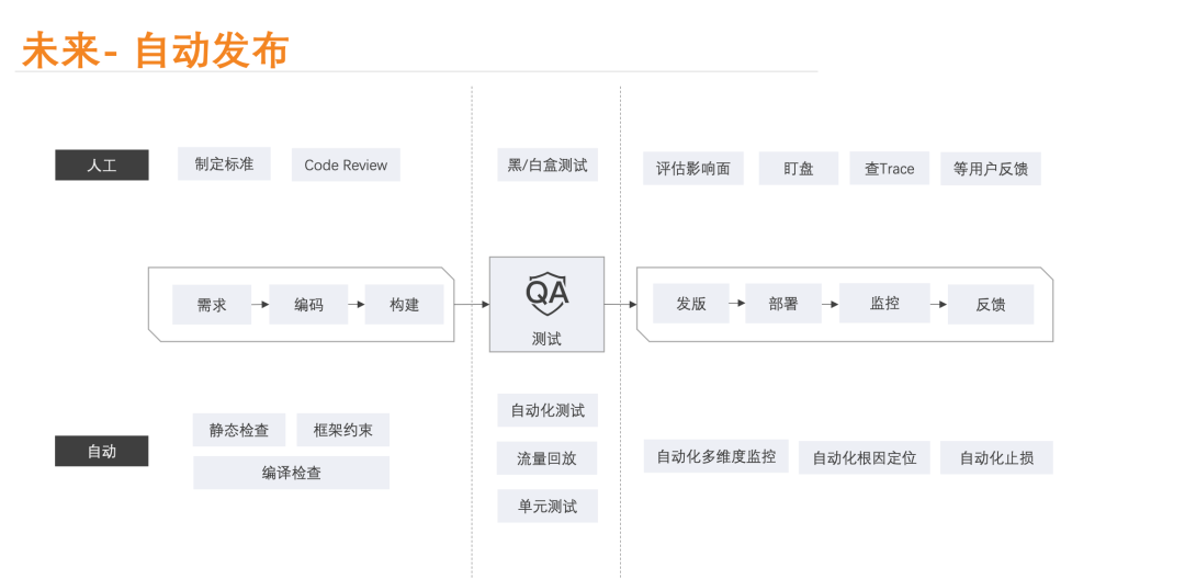 如果对整个 DevOps 进行人工和自动化区分,我们发现在每个环节里,尤其是在大规模的微服务架构下,人工的瓶颈越来越突出,比如在开发阶段,人工主要是制定规范,然后进行 Code Review等,但是每个人的能力、标准甚至同一个人不同时间点的心情都不一样,很难到达一个相对平稳的水平,而通过自动化,我们可以通过静态扫描、编译检查、框架约束等方式,把静态检查的能力提升到一个相对稳定的水平,包括我们刚提到的 AIOps 运维方式,也会将运维能力保持在一个稳定的水平,而我们可以通过不断优化自动化能力,来提高我们的能力下限。