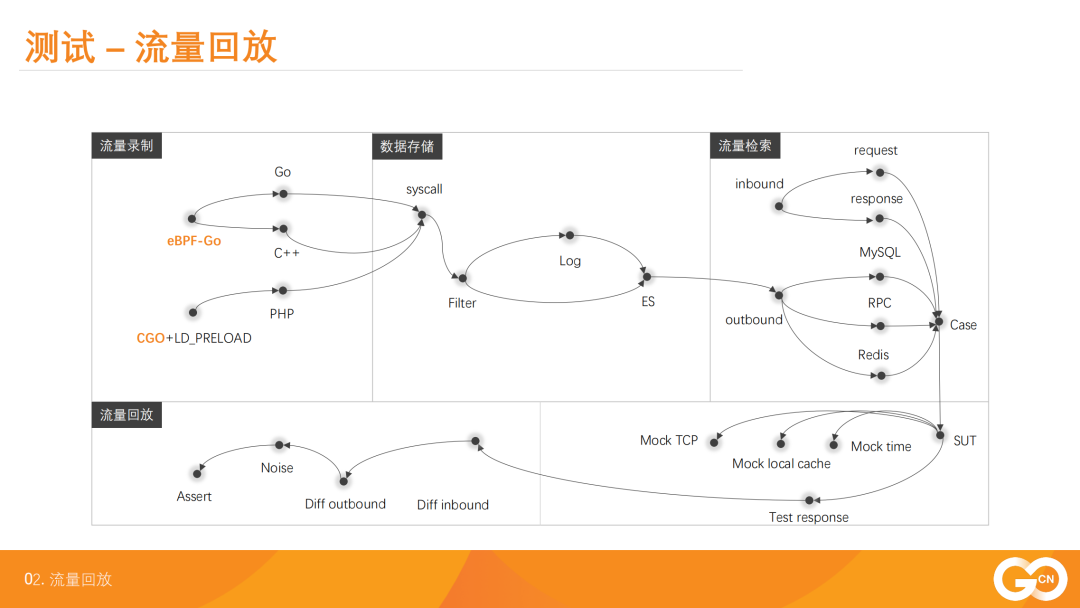 基于此,我们可以在不需要人工干预的情况下,就可以自动化的构建高覆盖率测试场景,然后大批量的进行回放,从而达到高覆盖率的回归测试。像我们前面提到的迁移框架、迁移Go技术栈,都依赖于这种方式。