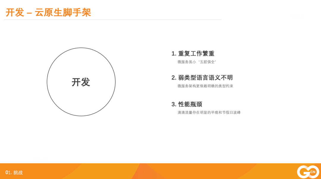 首先是上面提到的开发阶段繁重的重复性工作,比如服务发现、链路追踪、RPC调用等等。但还有其他的挑战,滴滴在最初技术选型的时候,针对业务开发选的是弱类型语言——PHP。PHP 最大的优势是快,它帮助滴滴快速实现了产品落地,抢占了市场先机,但随着业务复杂程度的提高,或者说微服务的交互越来越多,弱类型语言也暴露出来一些问题。一方面由于数据是弱类型,导致我们在跟一些强类型语言,比如 C++、Java 等进行交互时,经常会导致强类型语言崩溃;另一方面是性能问题,大家知道,在出行领域是有比较明显的谷峰流量特征的,比如早晚高峰、节假日高峰等,尤其是像五一、十一这种长假前一天的晚高峰,流量会很高,这时弱类型语言的性能问题会消耗大量机器资源,虽然滴滴通过弹性伸缩降低很大一部分成本,但高峰期的消耗依然很高。