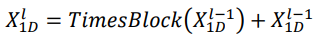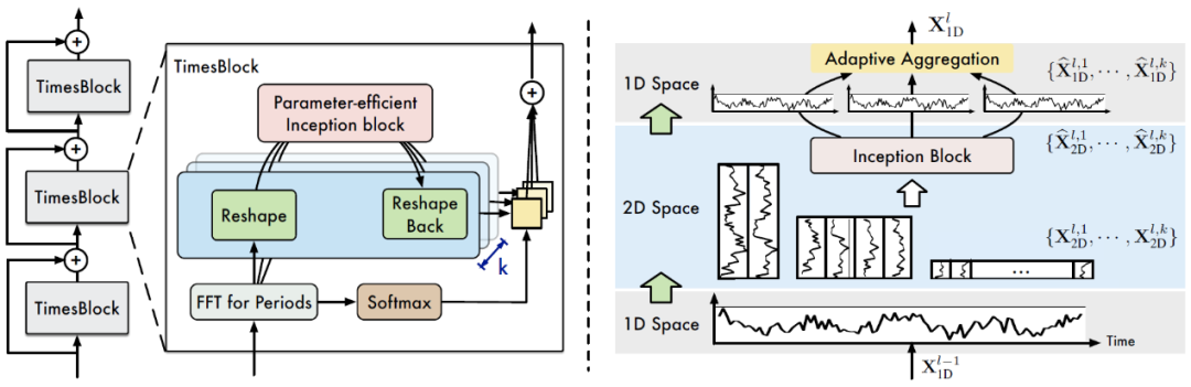 通过时间块的设计,模型完成了从多个周期分别提取二维时序变化,再进行自适应融合的时序建模过程。各个时间块之间进行残差连接,便于梯度的直接回传,可加速模型收敛、避免梯度消失。