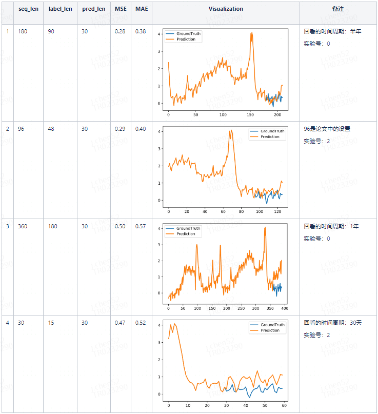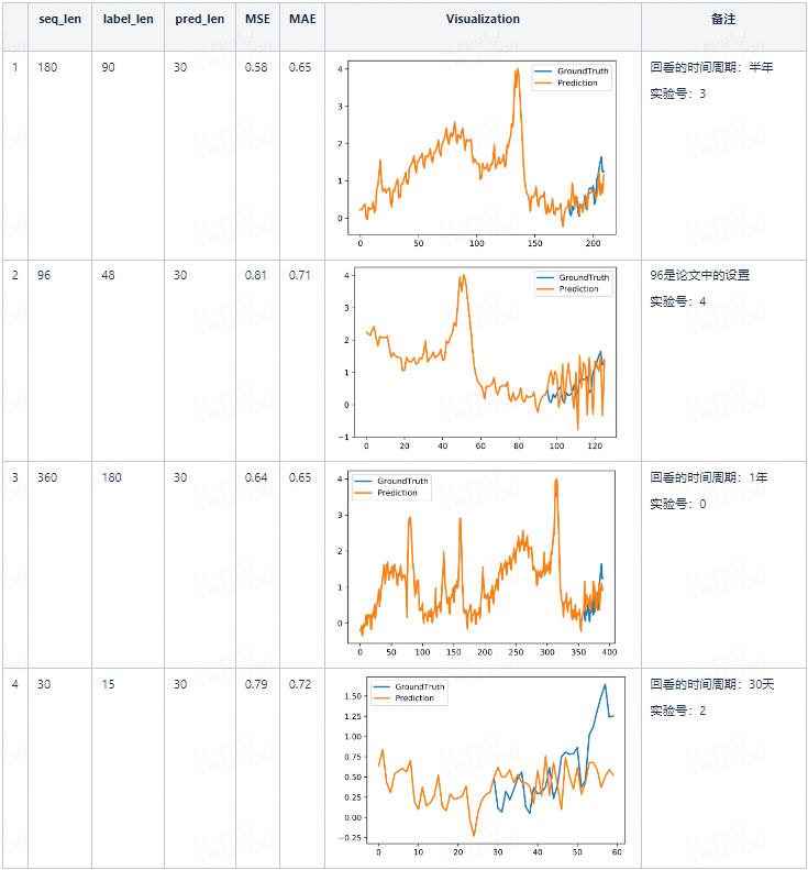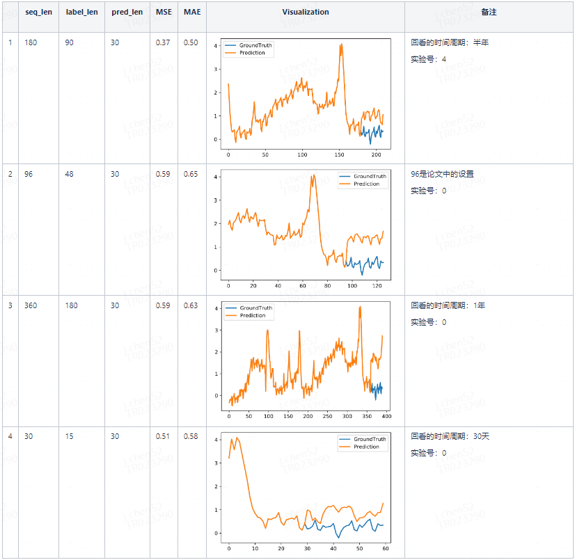 我们分别对不同的seq_len和label_len组合进行了对比实验,测试集的结果显示,当seq_len=180、label_len=90时,预测的结果最好。模型之间的横向对比显示,TimesNet的效果最好。