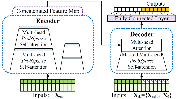 • 并行生成式解码器机制,对长时间序列进行一次前向计算输出所有预测结果而不是逐步的方式进行预测,这大大提高了长序列预测的推理速度。