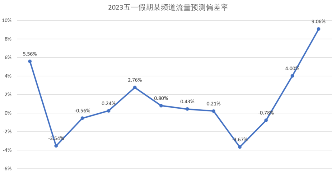 以某频道为例,我们应用模型预测五一节假日某频道的流量,平均预测偏差率为+1.03%,峰值预测偏差率为+0.43%,模型达到了非常优秀的效果。另外,选取五一假期的结束日期作为截止点,3天、7天、14天、21天、30天的平均预测偏差率分别为:+3.7%、+1.8%、+1.4%、+5.5%、-9.6%。
