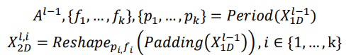 首先通过快速傅里叶变换对输入的一维时序特征提取周期,选取强度最大的k个频率{f1,…,fk},他们对应着最显著的k个周期{p1,…,pk},然后将其转化成二维张量。相关公式如下: