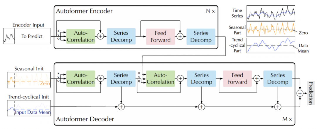 为突破上述问题,作者提出了名为Autoformer的模型,主要包含以下创新: